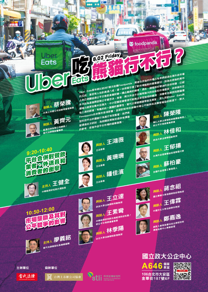為深入探討Uber Eats與Foodpanda合併案對市場的影響,當代法律雜誌將於2024年8月2日(星期五)上午9:00至12:00在政大公企中心A棟6樓A646階梯型會議廳舉行「Uber Eats(吃)熊貓行不行」研討會。本次會議由當代法律雜誌主辦,協辦單位包括台灣上市櫃公司協會及財團法人資訊工業策進會科技法律研究所。會議將以實體出席及YouTube線上收看方式進行,報名截止日期為2024年7月30日(星期二)17:00。