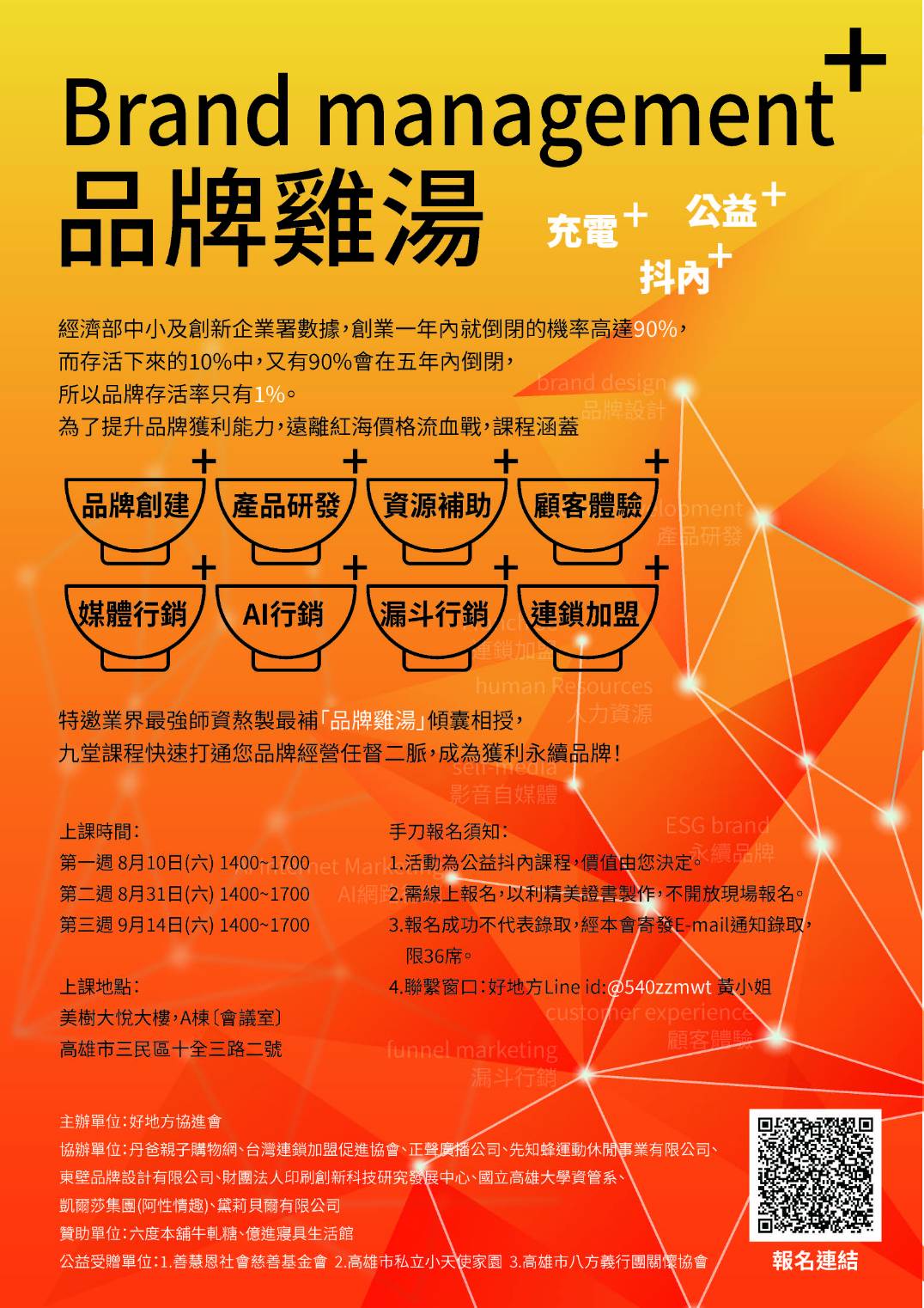 【記者于海燕/高雄報導】好地方協進會推出全新一系列公益課程,「品牌雞湯」致力於提升品牌的獲利能力和永續經營。