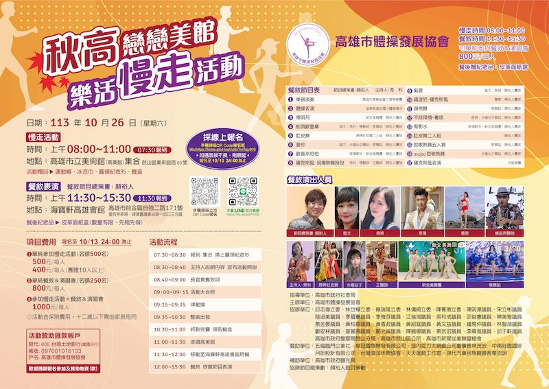 【記者于海燕/高雄報導】高雄市體操發展協會,為倡導臺灣慢(健)走活動風潮與鼓勵國人參與休閒體育活動,讓民眾體驗慢走之樂並讓民眾釋放緊繃的壓力,達到身心舒展目的,並感受運動帶來的好處,適逢秋高氣爽的季節,特別在高雄市立美術館(高美館)舉辦〈浪漫秋高戀戀美館慢走活動〉就等您呼朋引伴一同參加。