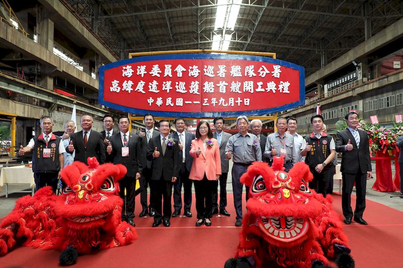 【記者于海燕/高雄報導】本(10)日上午10時,海洋委員會管碧玲主任委員與台灣國際造船股份有限公司黃正弘董事長於台船高雄廠共同主持「首艘高緯度遠洋巡護船開工典禮」。由管主委親自按下啟動開工鋼板切割按鈕,象徵正式開工,並為即將開始建造的巡護船祈福,祝願後續整體建造過程一切順利、平安。