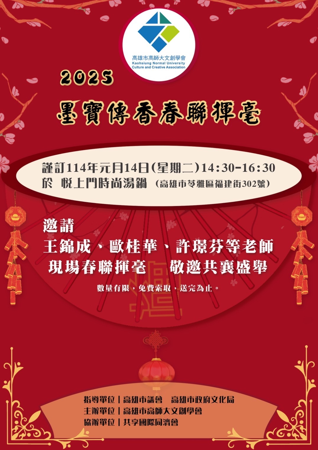 高師大文創學會表示,春聯是現今文化中不可或缺的年節習俗,透過書寫春聯,不僅能傳達對新年的祝福,也能讓書法藝術得以傳承。此次活動邀請到多位書法名家,他們以精湛的書藝,為民眾揮毫寫下充滿祝福的春聯,讓大家都能滿載而歸。