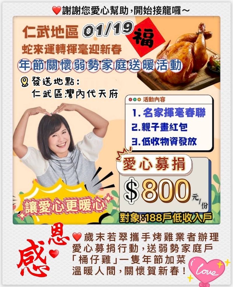 【記者于海燕/高雄報導】前高雄市議員陳若翠,訂一月十九日上午,在仁武區灣內代天府,舉辦新春「歲末底家幸福公益活動」,並募捐物資和桶仔雞一隻贈弱勢家庭,温暖助過春節。