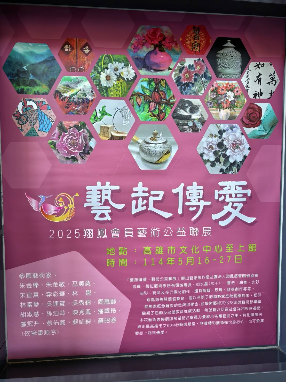 以關懷弱勢家庭孩童為宗旨的社團法人翔鳳慈善關懷協會,於5月16日至5月27日在高雄市文化中心至上館舉辦「藝起傳愛」會員慈善公益聯展,匯聚18位愛心藝術家的多元創作,以豐富的藝術形式搭建愛心橋梁,邀請民眾一同以行動溫暖社會。