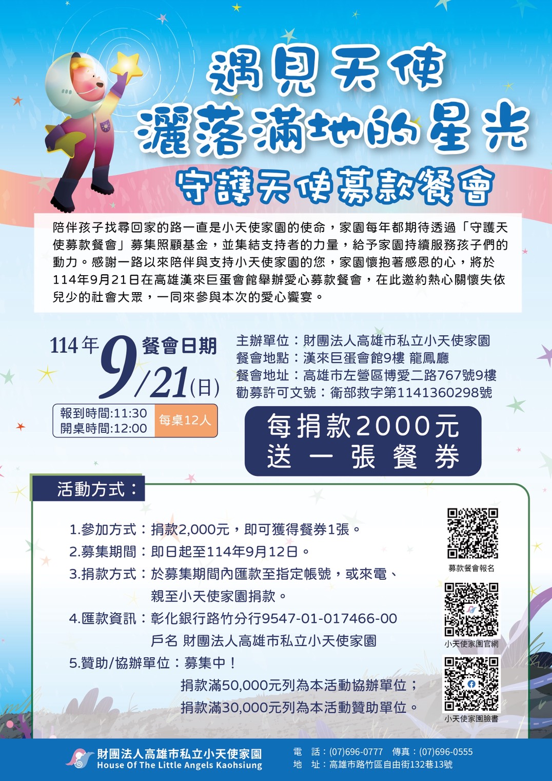 今年餐會以「遇見天使 灑落滿地的星光」為主題,象徵每一位善心捐款者都是孩子生命中的一束光,溫柔地照亮他們回家的路。活動將於高雄漢來巨蛋會館9樓龍鳳廳舉行,即日起,捐款人只要向小天使家園捐款2,000元,即可憑愛心餐券於9月21日至高雄漢來巨蛋會館一同參與公益饗宴,款項將用於家園孩子的生活照顧基金。