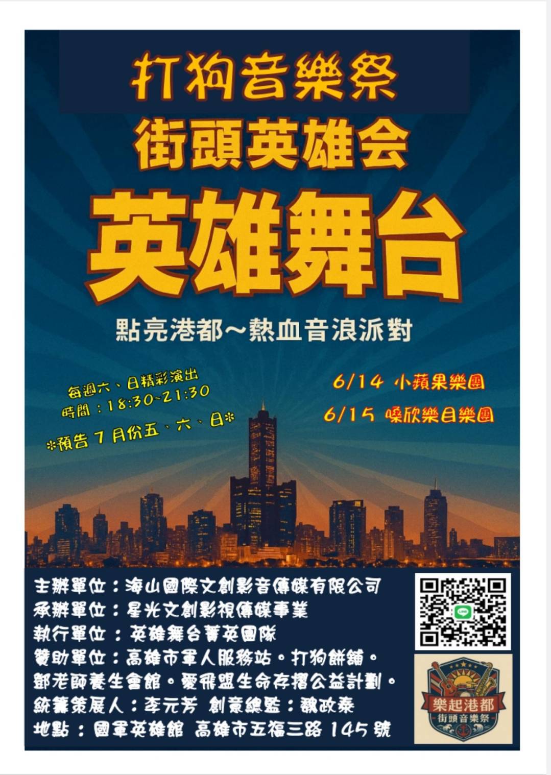 2025年6月28日至29日,高雄愛河灣即將舉行一場結合街頭文化與搖滾音樂的夏季盛會──「打狗音樂祭 街頭英雄會」,主題為「點亮港都~熱血音浪派對」,活動地點為國軍英雄館一樓的打狗餅舖英雄舞台(地址:高雄市鹽埕區五福三路145號)。兩天活動晚間18:30至21:30登場,將為高雄注入滿滿音樂能量與街頭活力。