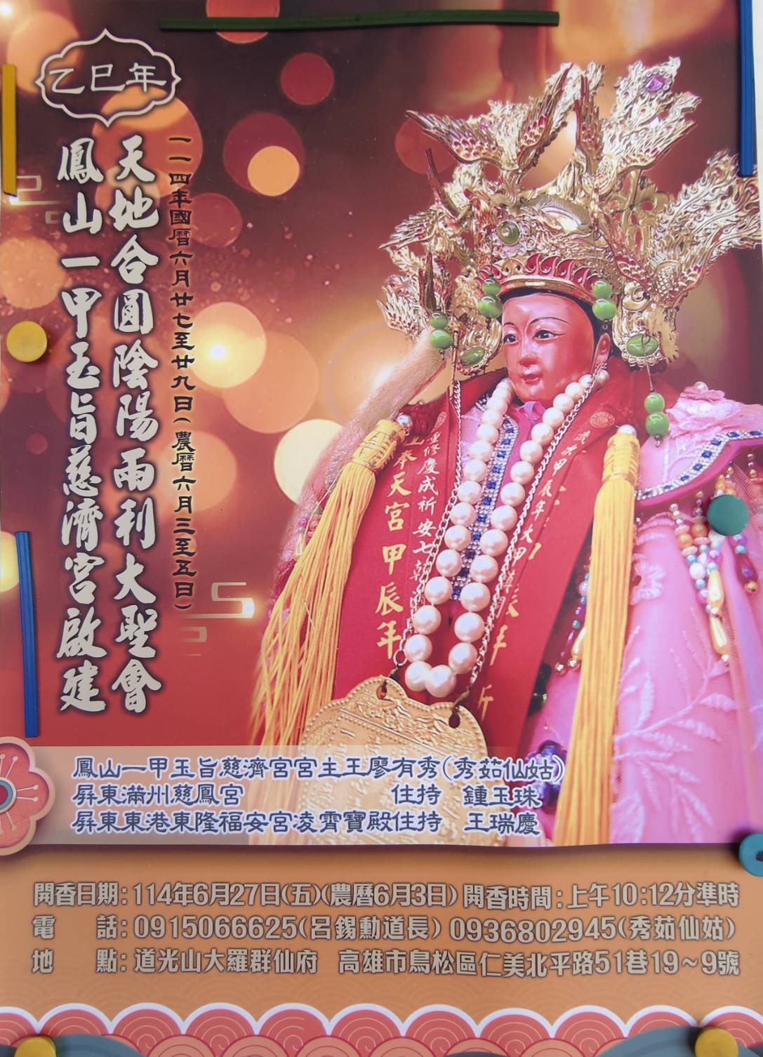為弘揚宗教精神、祈願人天共安,高雄鳳山一甲玉旨慈濟宮、屏東滿州慈鳳宮、屏東東港東隆福安宮凌霄寶殿,聯合主辦大型宗教科儀「天地合圓 陰陽兩利大聖會」,並由高事凌霄仙姑慈善會承辦。此次盛會訂於 6月27日至29日,假高雄鳥松道光山大羅群仙府隆重舉行,備受地方信眾與宗教界關注。