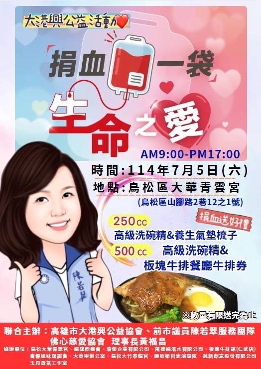 聯合主辦:高雄市大港興公益協會、佛心慈愛協會、前市議員陳若翠服務團隊、會馨姐妹聯誼會。捐血送愛活動內容:豐富捐血禮品、現場薩斯風溫暖演奏、親子擴香石DIY以及愛心物資發送、二手物義賣。歡迎大家踴躍來做愛心,捐血一袋救人一命功德無量。