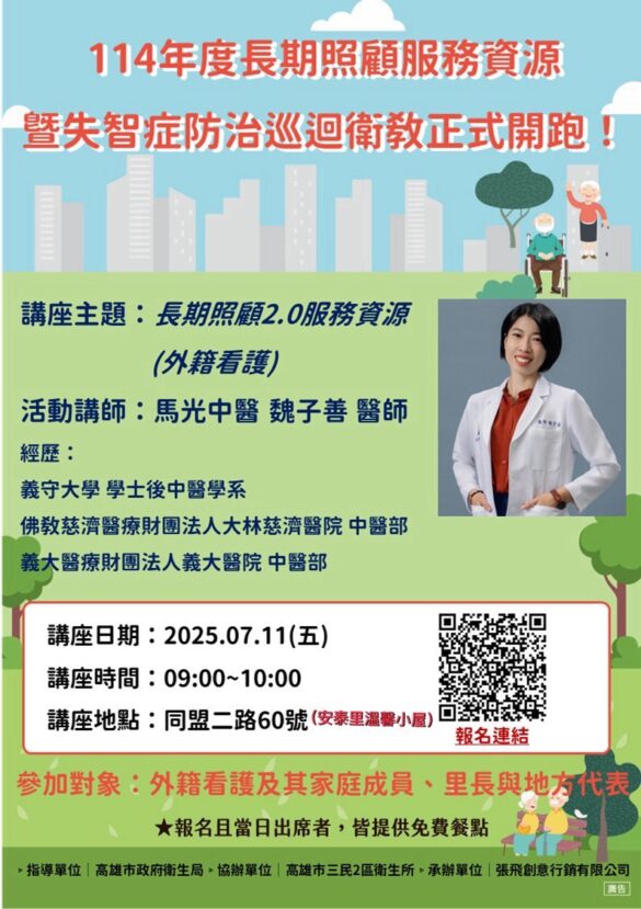 為加強社區對長期照顧資源的認識與應用,高雄市三民區於今(7月11日)上午9點在同盟二路60號「安泰里溫馨小屋」舉辦「114年度長期照顧服務資源暨失智症防治巡迴衛教講座」。此次講座主題為「長期照顧2.0服務資源(外籍看護)」,特別邀請馬光中醫魏子善醫師主講,吸引許多外籍看護、家庭照顧者與地方居民熱情參與。