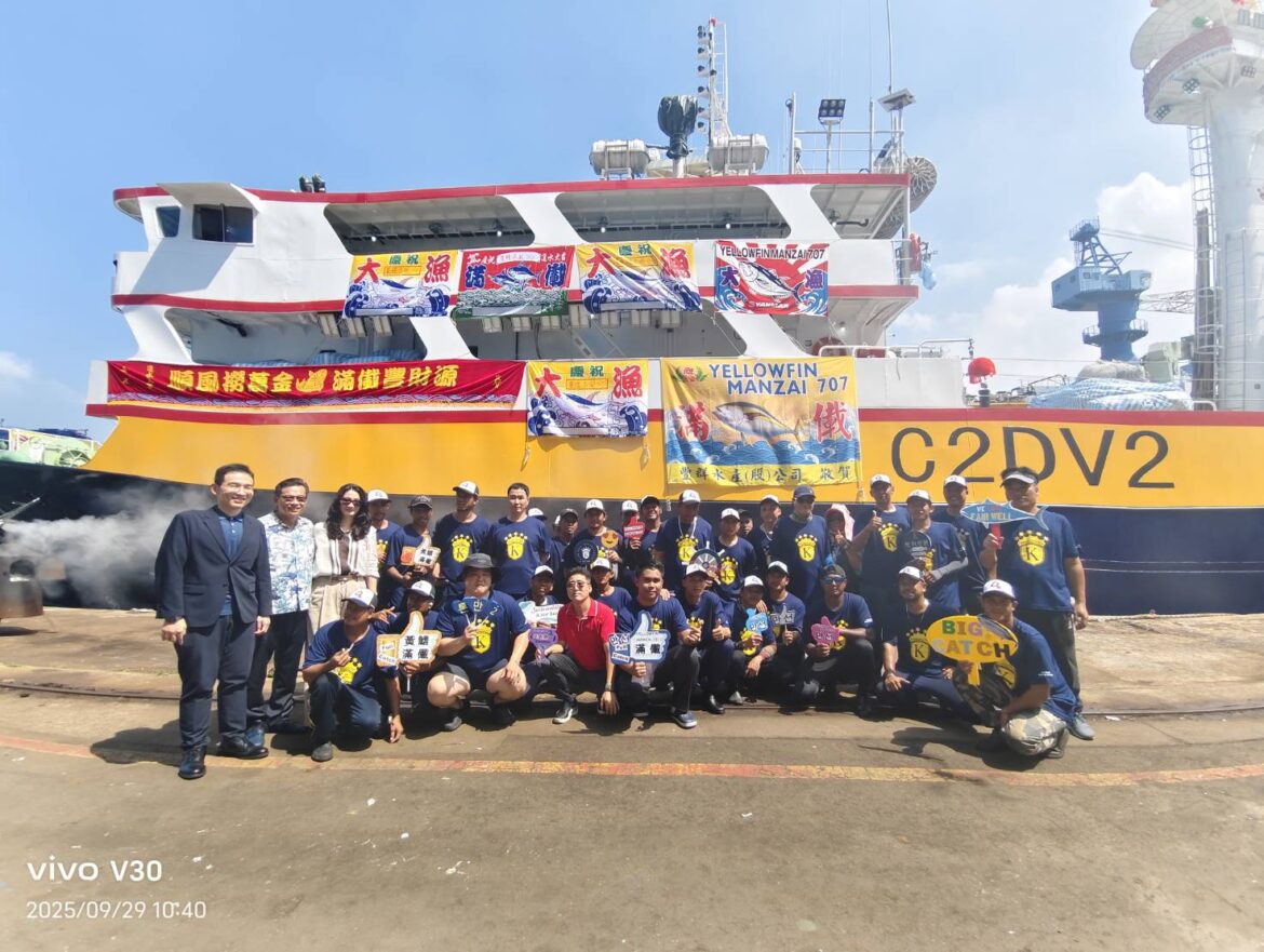 出港儀式現場氣氛熱烈,韓籍漁撈長與船員手持加油手板合影,展現國際團隊的向心力。華偉漁業董事長黃一茂與高雄市漁會總幹事親自送上祝福,強調持續強化後勤補給與人員調度,做船員最堅強的後盾。隨著繩索鬆綁,在領港船引導下,黃鰭滿儎707正式啟航,碼頭邊鞭炮與歡呼聲迴盪,象徵嶄新的豐收航程正式展開。