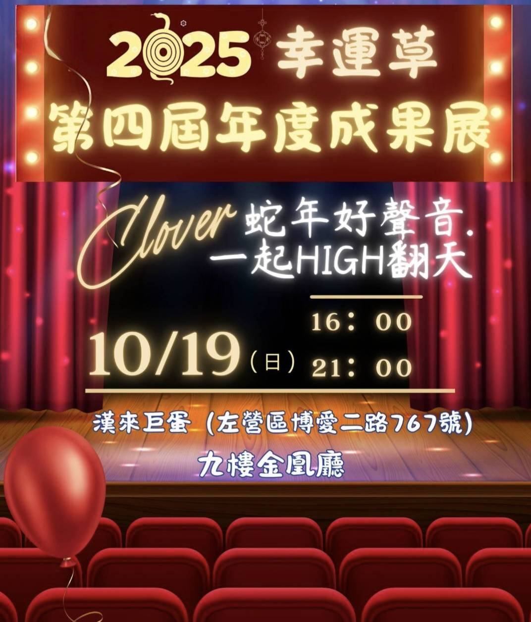 「2025幸運草第四屆年度成果展」於10月19日下午,在高雄漢來巨蛋九樓金鳳廳隆重登場。活動由高雄市幸運草歌藝共好協會主辦,以「蛇年好聲音・一起HIGH翻天」為主題,邀請學員齊聚舞台展現音樂實力與滿滿熱情。從16時至21時,現場座無虛席,熱鬧的掌聲與喝采聲此起彼落。