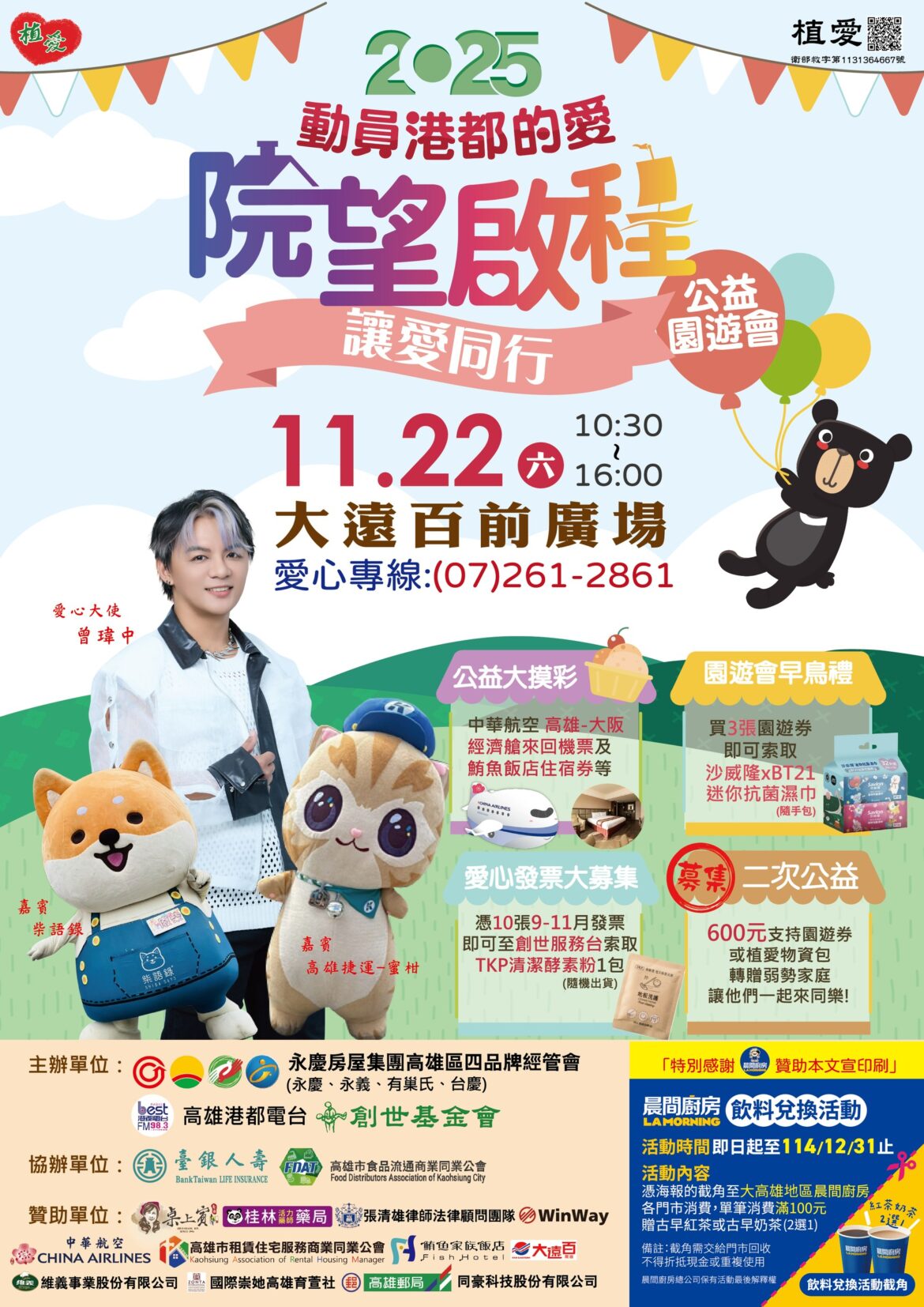 活動預計設有 60 個攤位,內容包括裕賀牛現煎牛排、宏裕行蝦餅、阿綿麻薯等在地伴手禮與特色美食;還有服飾義賣、遊戲闖關;當天亦邀請幼兒園孩子以活力四射的開場表演揭開序幕,從視覺、味覺、聽覺全面動員,營造歡樂公益氛圍。 此外,愛心大使 曾瑋中、知名 IP 「柴語錄」、蜜柑站長也將到場與民眾互動;園遊券每張 200 元,持券即可參加摸彩,有機會抽中 中華航空 高雄-大阪來回機票、鮪魚飯店住宿券等多項好禮。更值得一提的是,認購三張即贈沙威隆 × BT21 聯名濕紙巾一組(限量)為預購好禮。