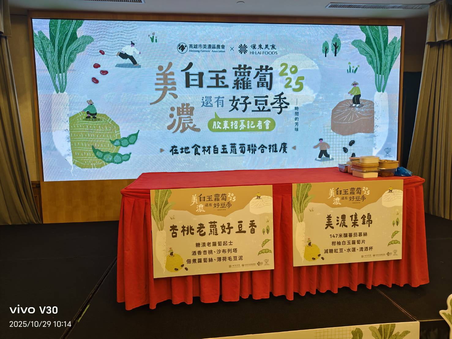 高雄市美濃區農會今(10/29)於高雄漢來大飯店舉辦「2025美濃白玉蘿蔔還有好豆季」股東招募記者會,正式啟動今年的白玉蘿蔔與毛豆股東會活動。以「從產地到餐桌」為主軸,活動不只要讓更多消費者走進農田,更攜手南台灣餐飲龍頭「漢來美食」,共同打造食農文化永續推動的新典範。