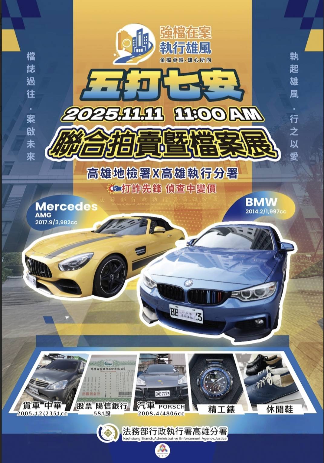 法務部行政執行署高雄分署今(11)日上午在分署大禮堂舉行「五打七安聯合拍賣會暨囑託變價檔案展」,與全國各行政執行分署同步視訊連線,共同展現落實行政院「五打七安」政策的執法決心。本次拍賣會以檢察機關囑託變價案件為主軸,包括賓士AMG敞篷名車、鳥松區多筆不動產與旗山區房屋等標的,吸引眾多民眾到場應買,現場氣氛熱絡。總成交金額達3,336萬6,750元,充分展現檢察機關與行政執行機關「檢執聯手」打擊不法、追徵犯罪所得的強大效能。