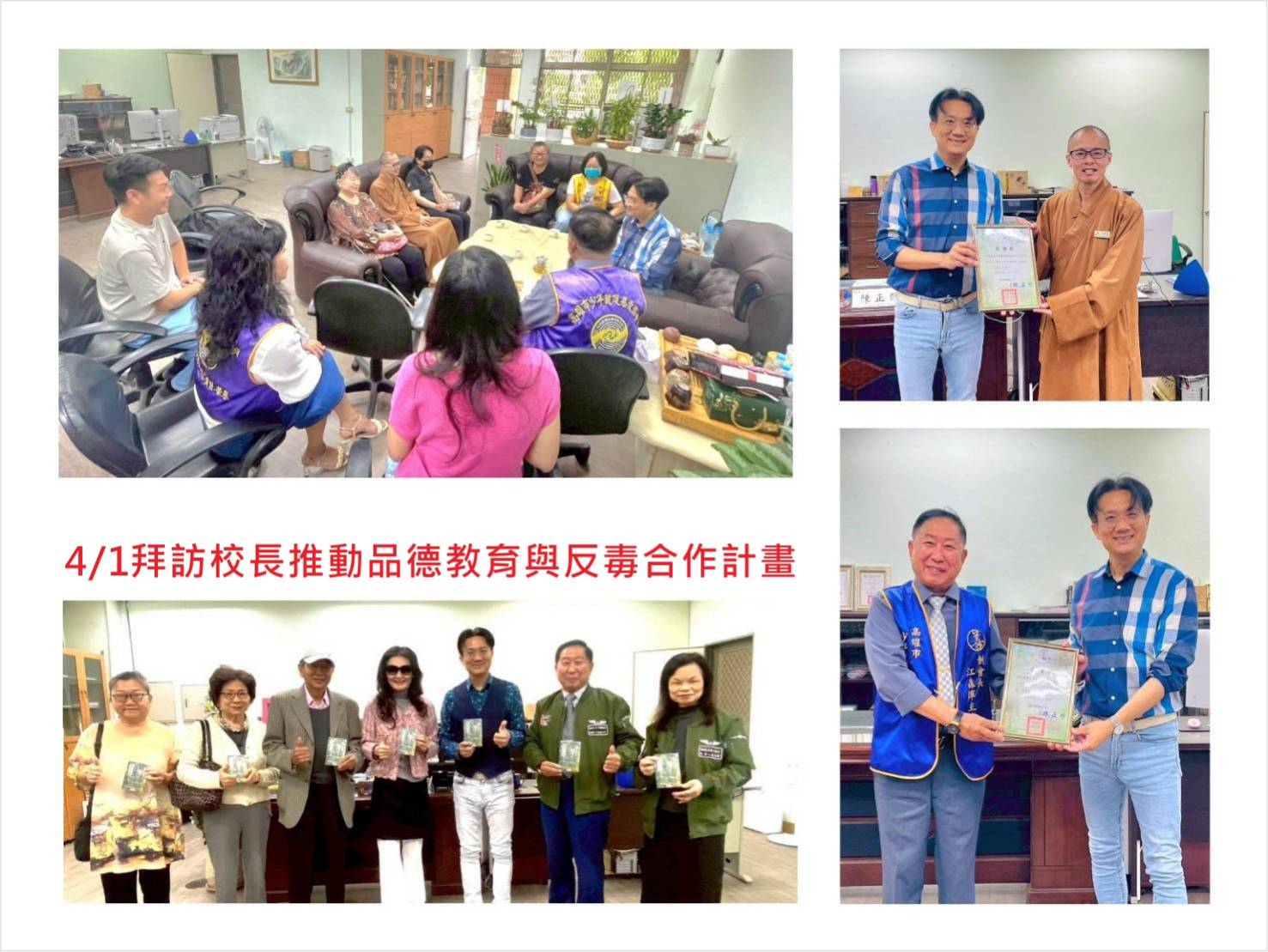 民間力量與學校結盟,展現素養教育新典範;今年 4 月在秘書長高櫻芳導護老師引薦下,協會由前普門中學校長蔡清波觀護委員率隊拜訪楠陽國小,提出長期合作規劃,並獲校方大力支持。此後數月,協會三度走入校園:1.推動品德教育  2.建立閱讀激勵機制  3.展開反毒藝術行動。
