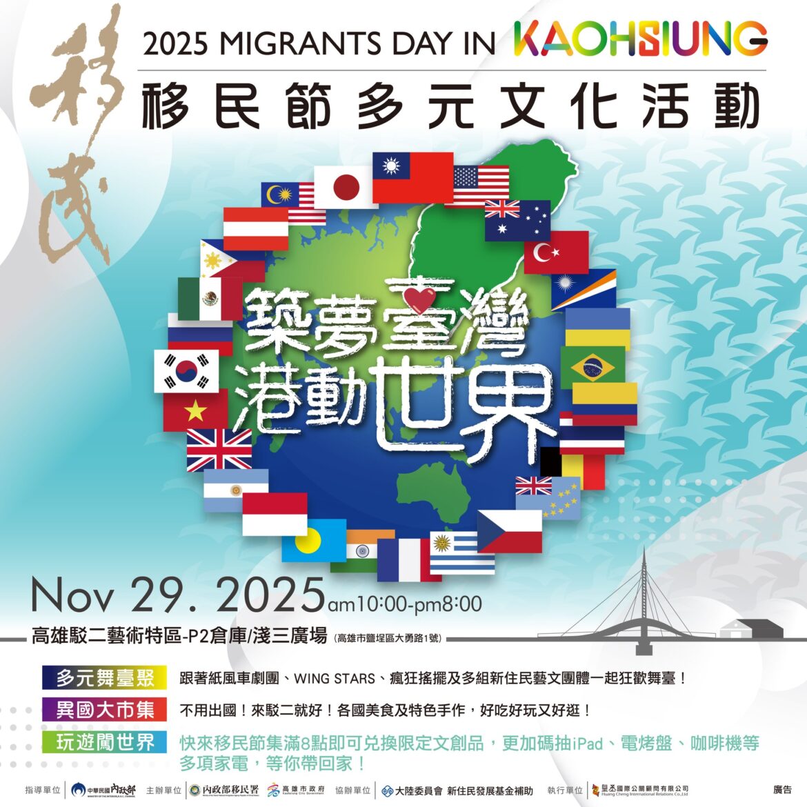 「114 年移民節嘉年華會」今年主題為「築夢臺灣 港動世界」,於高雄駁二藝術特區 P2 倉庫及淺三廣場舉辦,場域佈置充分利用港市風情與文創氛圍。現場匯聚異國市集、文化表演、親子活動與移民家庭展示,展現多元族群與文化融合的美好畫面。 活動中,主辦單位也安排對新住民與移工的表揚典禮,表彰包括來自印尼、越南、泰國、菲律賓等國的新住民傑出代表,他們長年在家庭、職場與社會付出,成為台灣多元社會不可或缺的一份子。這不僅是對個人努力的肯定,也象徵台灣社會對新住民貢獻的尊重與認同。