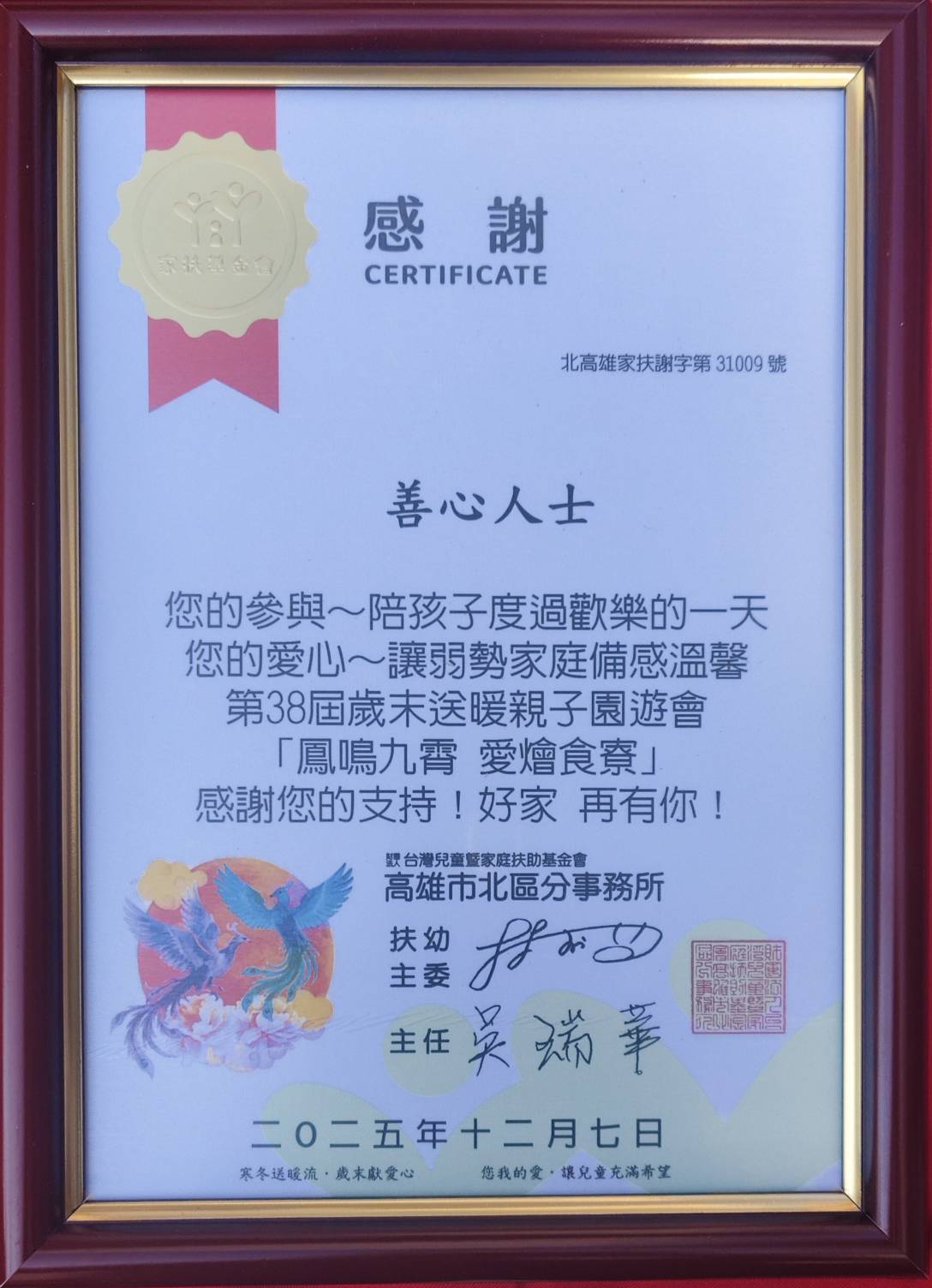 讓幸福不間斷,陪孩子迎向新一年;從園遊會的歡笑聲,到專車啟用的啟程時刻,再到一份份歲末禮物送進2,500戶家庭手中,北高雄家扶38年的陪伴,已成為地方最溫暖的存在。這場歲末送暖,不只是年度活動,更是一種社會承諾——讓弱勢家庭知道,他們並不孤單。北高雄家扶表示,未來將持續結合社會各界力量,陪伴孩子在成長路上穩定前行,讓愛在新的一年繼續傳遞、生生不息。