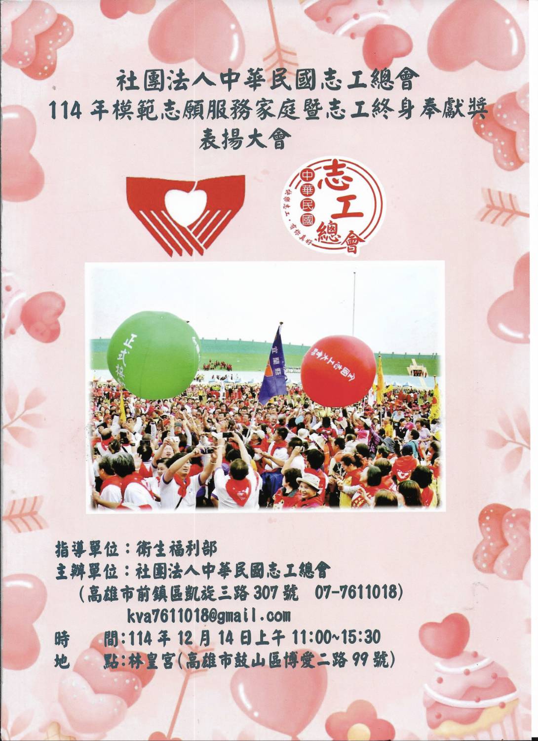 在歲末感恩的季節裡,象徵無私奉獻的志工精神再度成為社會關注焦點。中華民國志工總會昨日(14)舉辦「114年模範志願服務家庭暨志工終身奉獻獎表揚大會」,表彰長年默默付出的志工個人與家庭。活動不僅是對志願服務成果的肯定,更展現台灣社會深厚的人文底蘊,讓「服務」不只是行動,而是一代代相承的生命價值。