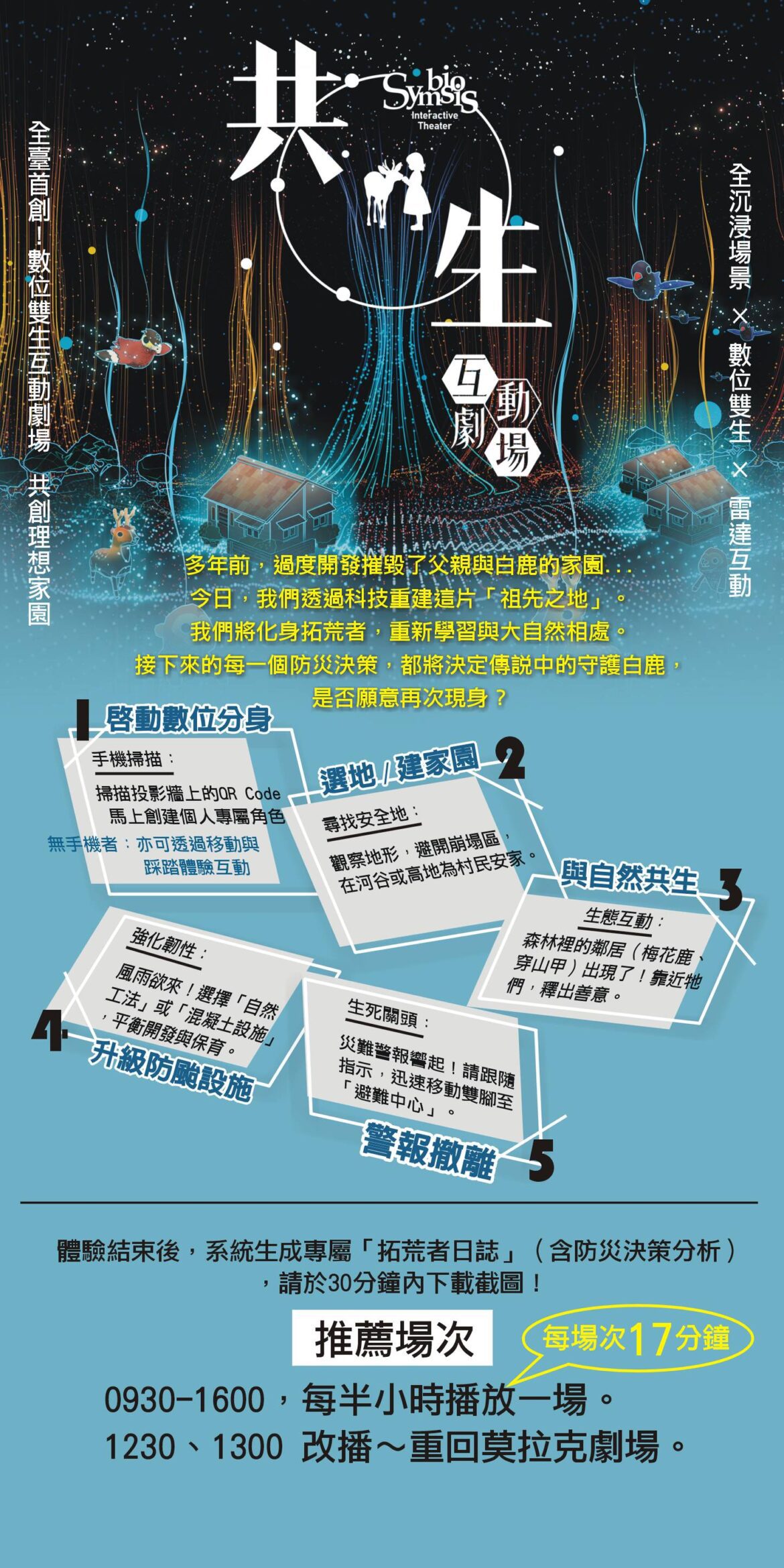 「共/生 互動劇場」由教育部、農業部農村發展及水土保持署與國立科學工藝博物館共同規劃,透過科技與故事的結合,讓防災教育不再遙遠。這不只是一場17分鐘的體驗,更是一堂關於土地、選擇與責任的行動課程。科工館期盼,透過親身參與的學習方式,培養孩子與家庭尊重自然、建立韌性社區的能力,為未來打造更安全的家園。