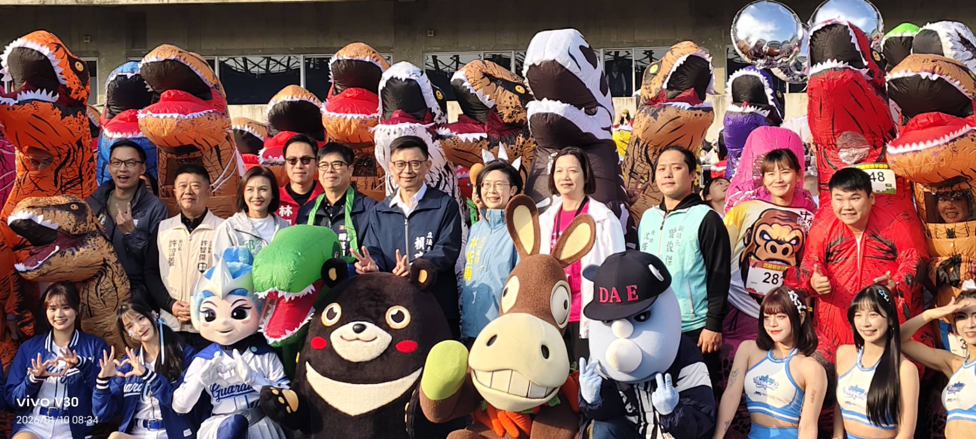 吉祥物略顯笨拙卻全力以赴的動作,搭配啦啦隊女孩充滿活力的舞蹈節奏,讓看台區笑聲與掌聲不斷,也成功拉近運動賽事與親子族群的距離。隨後登場的「最速恐龍爭霸賽」更是全場焦點,今年共有212隻恐龍報名參賽,在市長陳其邁、多位立法委員、議員及副議長曾俊傑服務處代表,以及富邦人壽代表與日本友好城市團隊帶領下,恐龍們完成暖身後熱鬧開跑,畫面壯觀又逗趣。