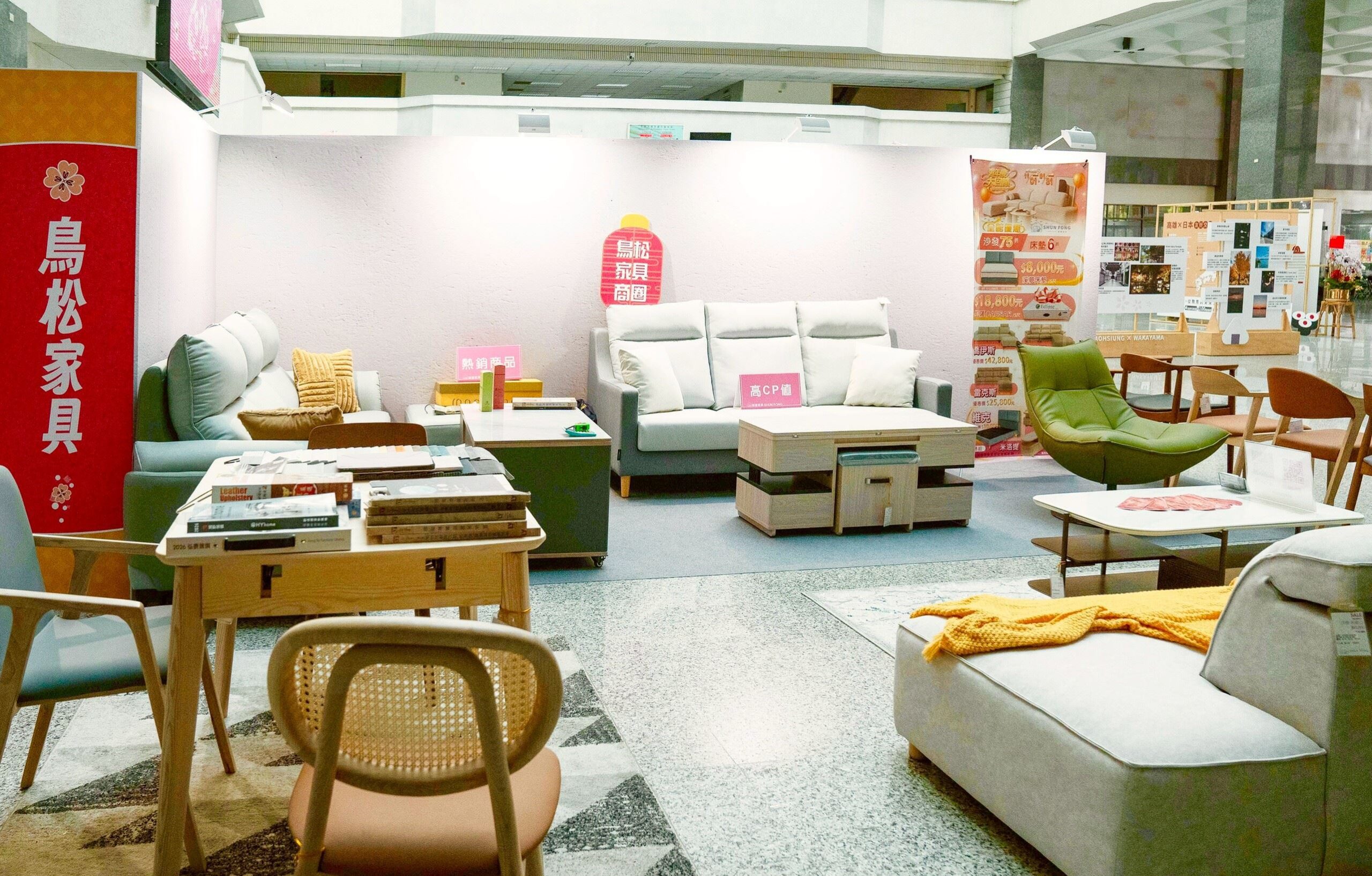 青年家具街與鳥松家具街也在市府中庭設置家具展區,搶攻年前除舊佈新、換新居的商機,展出期間每日8時至17時備有優惠與好禮,為市民新增年節選購選擇。