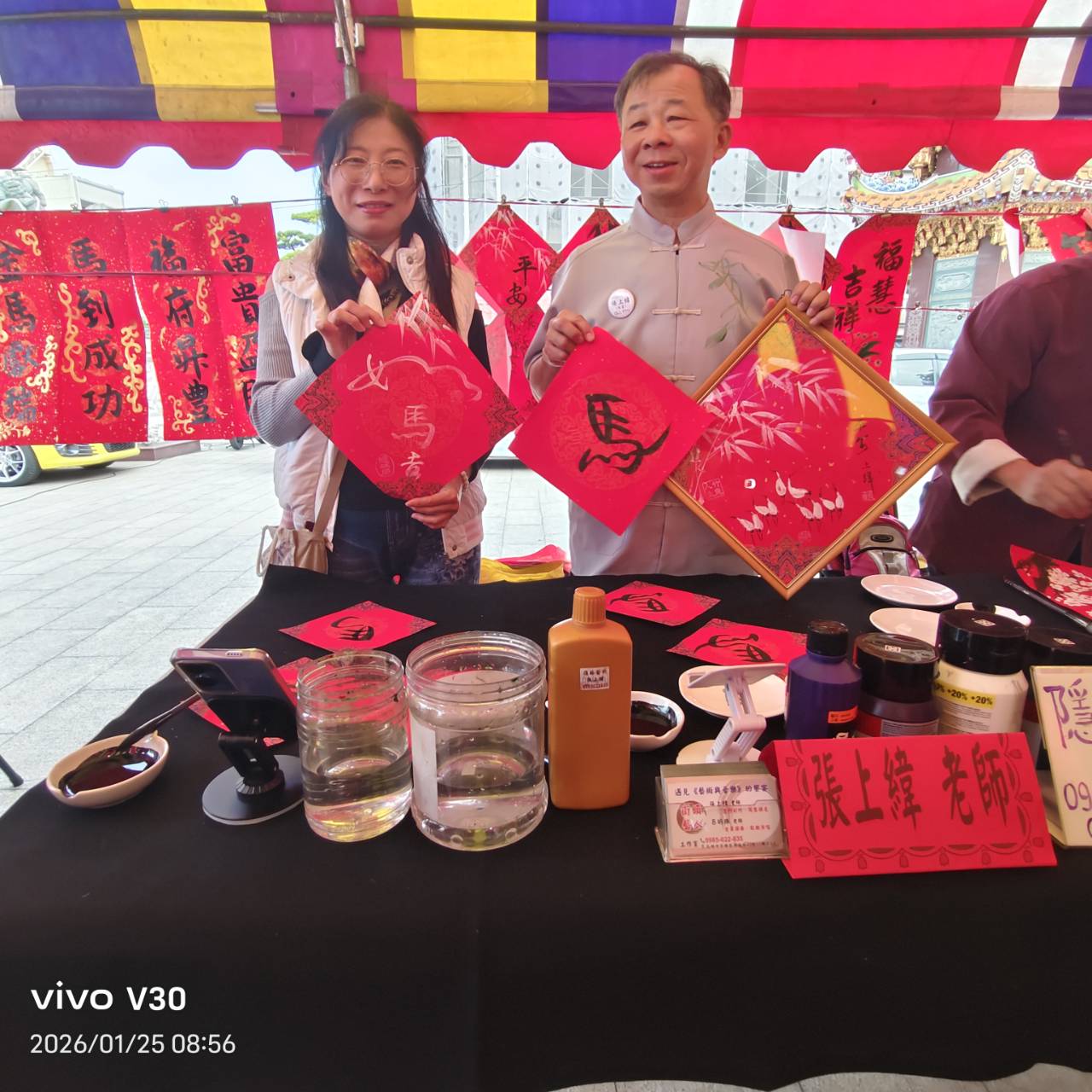 活動現場開放民眾自由索取手寫春聯,從「國泰民安」、「闔家平安」到寓意向上的吉語,字字皆由藝術家即席創作,承載真誠心意。主辦單位表示,手寫春聯不只是裝飾,更象徵人與人之間的祝福與連結,透過公益揮毫,讓藝術成為社會關懷的媒介,也讓文化傳承自然地融入年節記憶。
