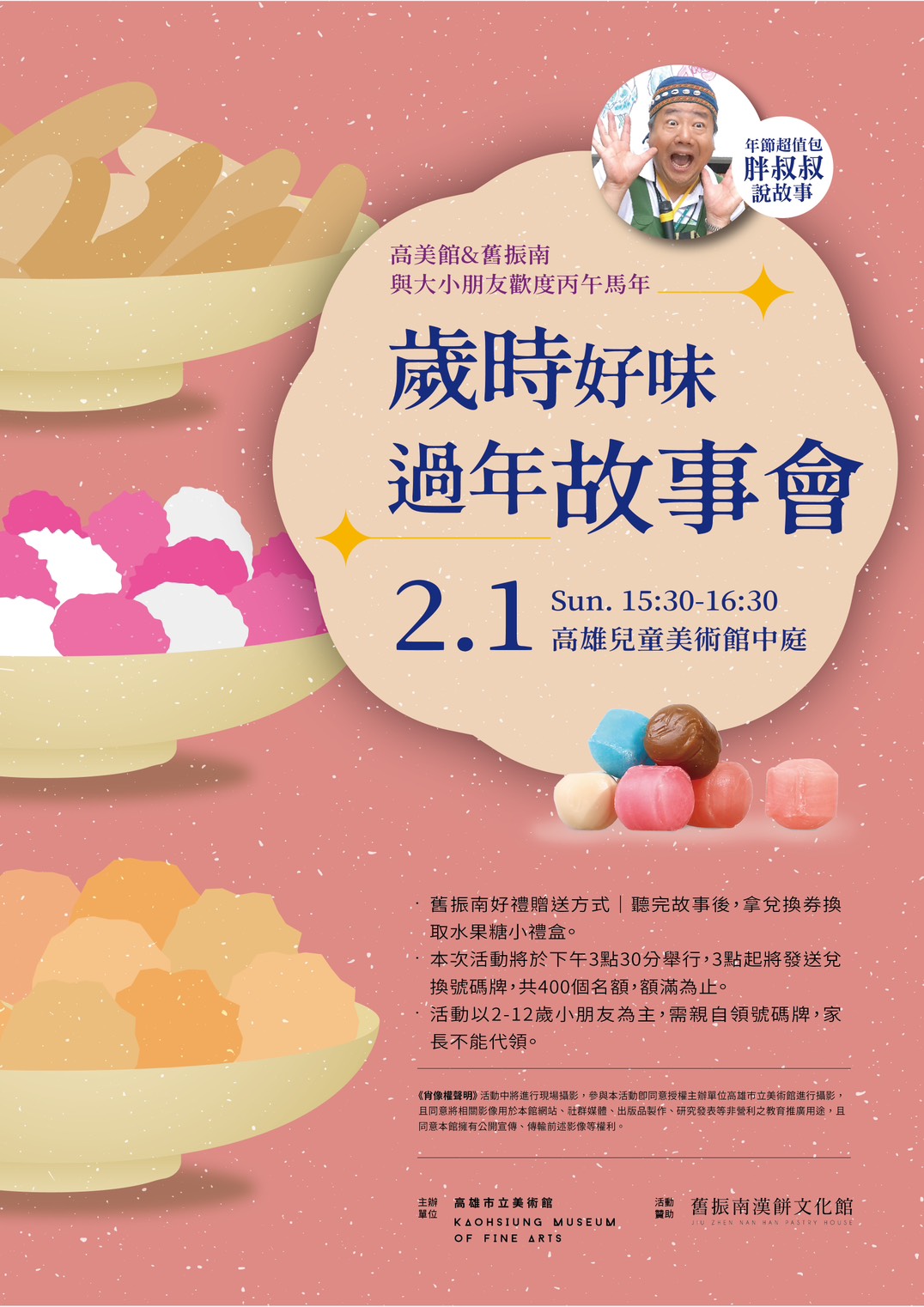 活動當日,前400位參與的孩子可於活動結束後,憑號碼牌兌換限量年節贈禮,讓孩子在故事餘韻中,品嘗象徵祝福的年味點心。透過故事與味覺記憶的結合,讓傳統文化成為孩子成長歷程中自然的一部分,也讓節慶體驗更加立體而深刻。