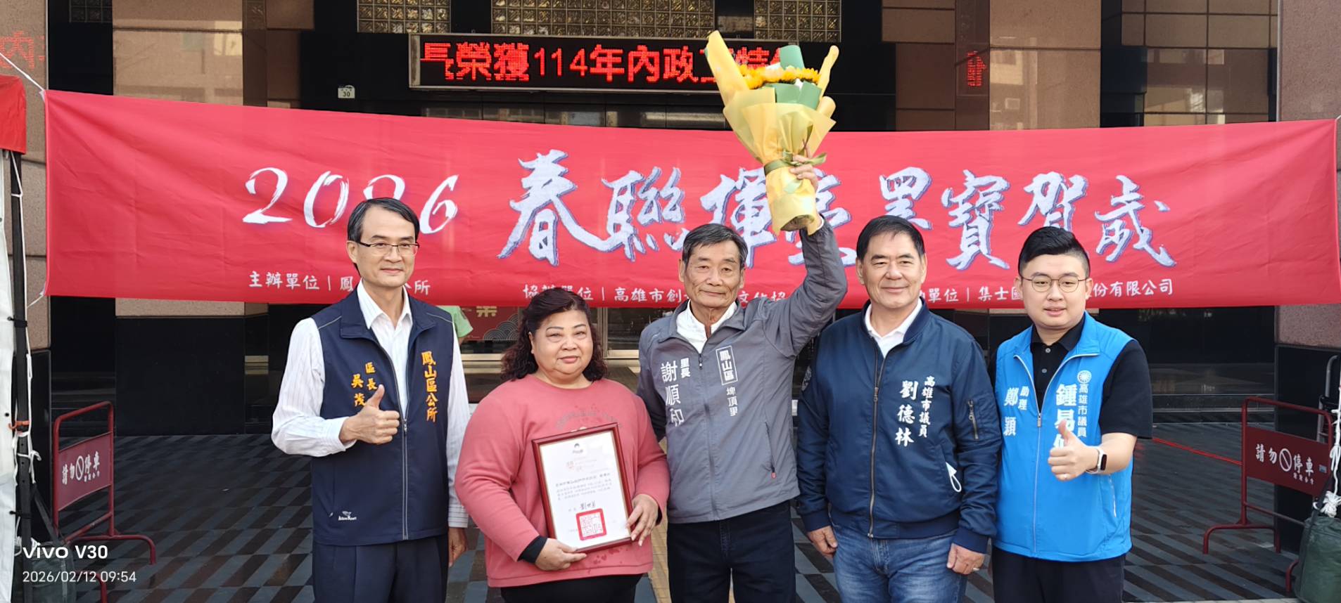 開場儀式特別邀請14位貴賓共同參與「2026春聯揮毫墨寶賀歲吉祥秀」,象徵文化與祝福的集體傳遞。區長現場揮毫寫下「鳳舞春意盎然盛、馬奔盛世昌隆興」對聯,上下聯氣勢磅礡,寓意鳳山地區新年祥瑞、百業興旺,也呼應馬年奔騰向前的吉祥象徵。