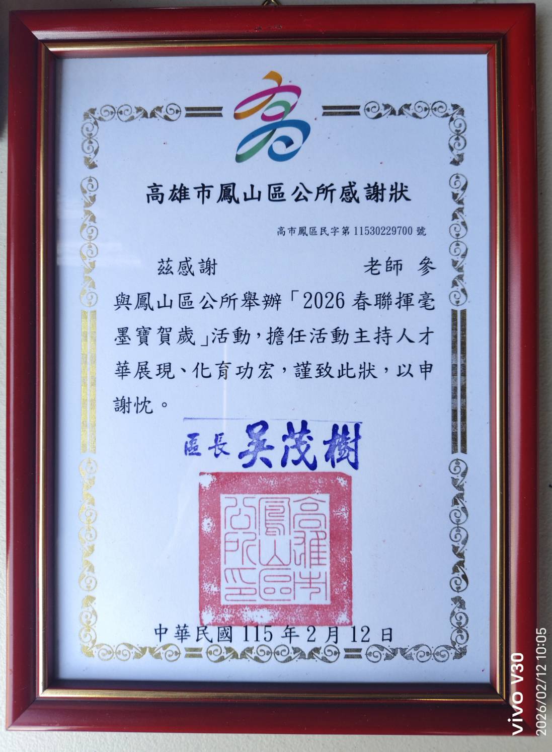 活動由鳳山區長吳茂樹揭開序幕,他表示,春聯揮毫不只是寫字活動,更是傳承傳統文化、凝聚社區情感的重要方式。透過書法藝術的展現,讓市民在迎接新年的同時,也感受文化底蘊與節慶儀式感。